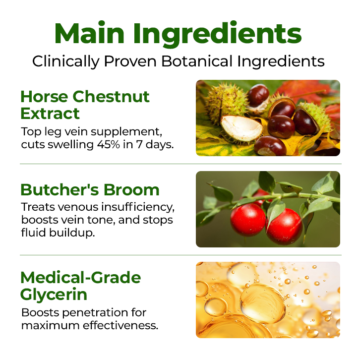 Horse Chestnut Extract: The only widely accepted supplement for leg vein symptoms. Reduces swelling and inflammation by up to 45% within 7 days.